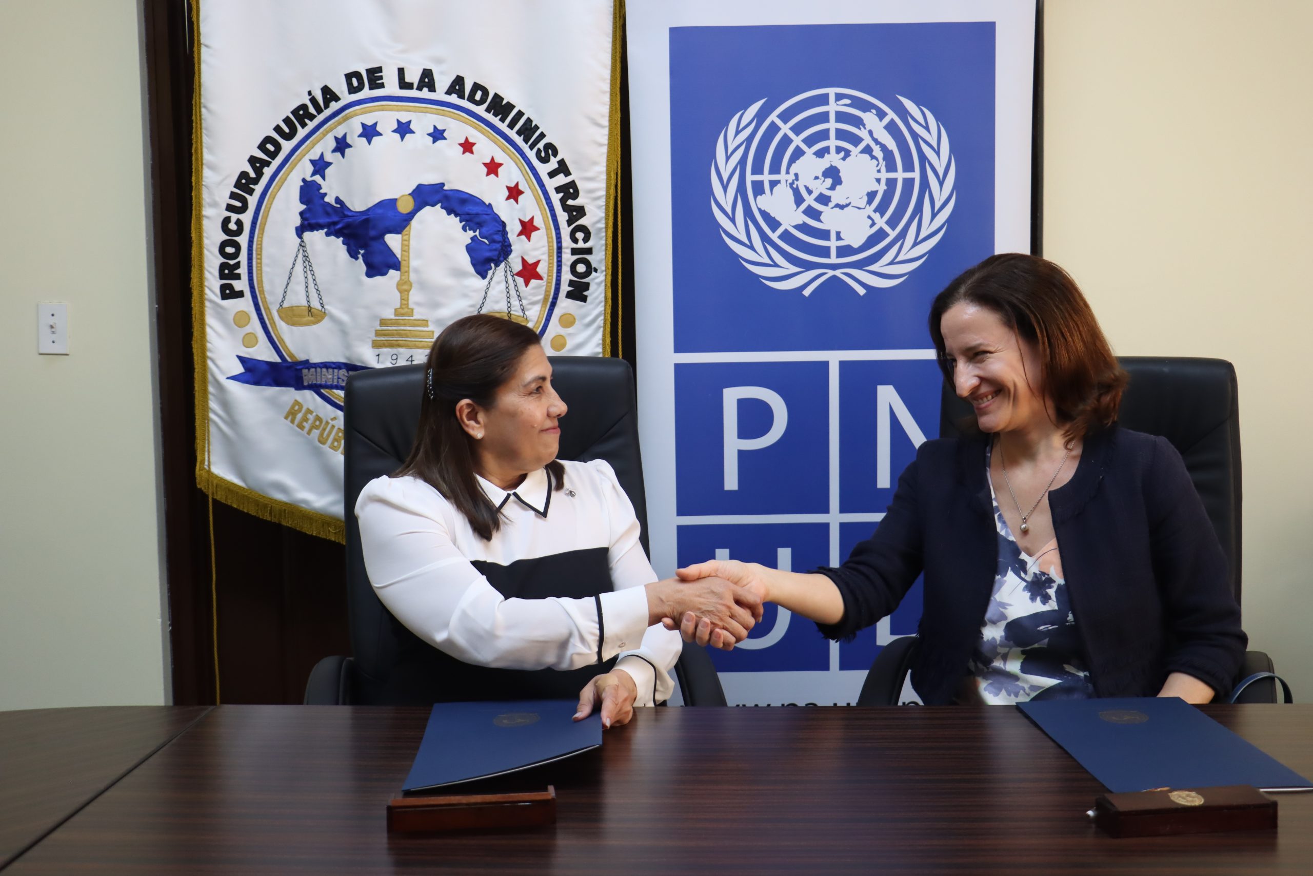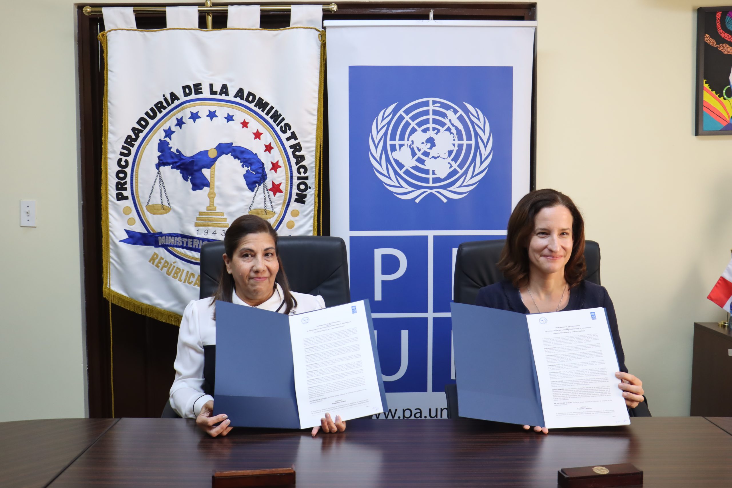 La procuradora de la Administración, Grettel Villalaz de Allen, y la representante residente del Programa de las Naciones Unidas para el Desarrollo, Bettina Woll, firmaron este jueves un Memorando de Entendimiento que establece un marco de cooperación entre ambas entidades.